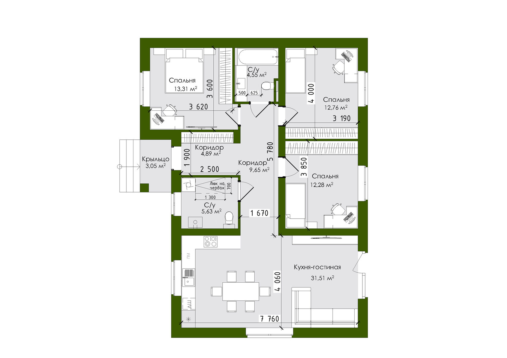 Потолок: 2,75 м Кухня: 31 м² Фасад: Кирпич Фундамент: свайно-ростверковый или монолитная плита, гидроизоляция, утепление ЭППС Стены: газоблок 300 мм, утеплитель 50 мм пенополистирол Кровля: 4-х скатная вальмовая, металлочерепица GRANDLINE, утепление 200 мм минеральная вата, водосток из ПВХ Перекрытие: чердачное перекрытие по лагам Окна: ПВХ VEKA WHS или аналог Дверь: утепленная входная дверь Вентиляция: естественная, вентиляционная шахта с 3-мя трубами, в том числе фановая труба Отмостка: бетонная утепленная шириной 60 см Электричество: 4 гильзы из трубы ПНД32, в которые можно протянуть кабель Канализация: труба канализации в утеплителе под домом с выпуском из фундамента на расстоянии 1 п.м. от дома на глубине 60 см. Водоснабжение: выпуск из фундамента рядом с домом трубы ПНД32 на глубине 1,5 м